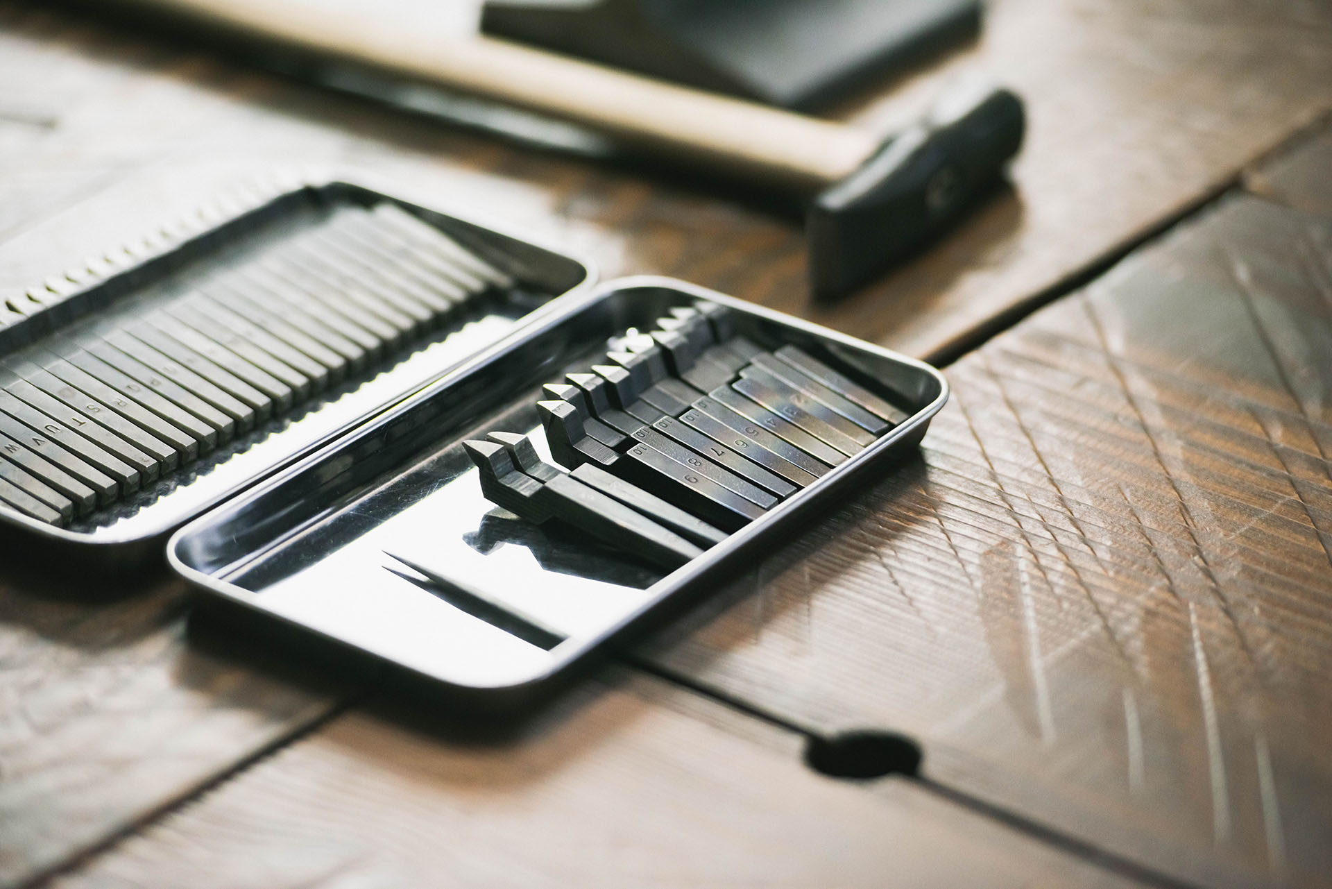 シルバーバングルを手作り体験できるワークショップです。2種類の形状に、好きな文字や記号を刻印して、7種類の表面加工を行うことができます。