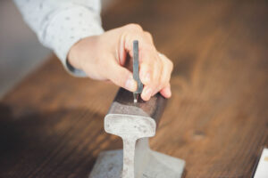 鉄製の刻印をひとつひとつ選び、金槌で打ち込んでいきます。